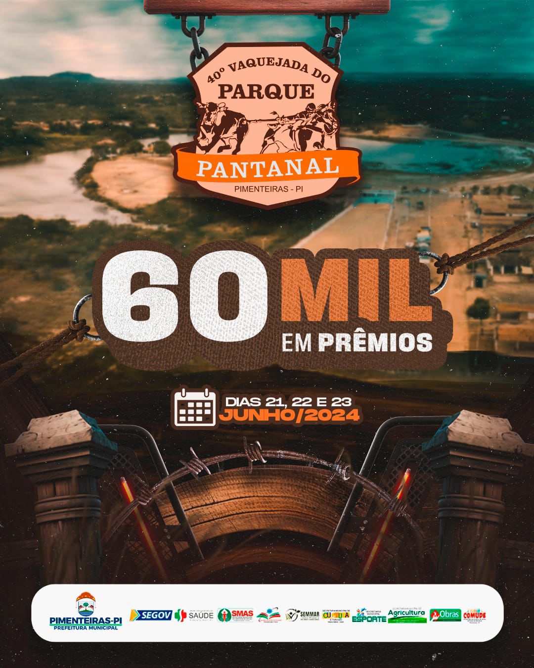 Nos dias 21, 22 e 23 de junho de 2024, acontece a 40ª edição da tradicional vaquejada do Parque Pantanal em Pimenteiras, Piauí! Serão R$ 60 mil em prêmios! Fique ligado para mais informações nos perfis oficiais da Prefeitura Municipal de Pimenteiras. Não perca essa festa imperdível! #Vaquejada #Pimenteiras #ParquePantanal.