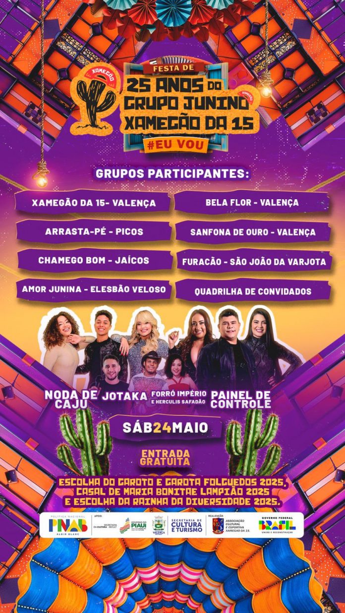 Será comemorado no CROVAPI Clube em Valença do Piauí, neste sábado 24 de maio o aniversário de 25 anos do “Grupo Junino Xamegão da 15“, com as bandas: Noda de Caju, JOTAKA, Forró Império e Hercules Safadão e Painel de Controle.
