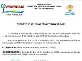 Prefeitura de Pimenteiras decreta ponto facultativo nesta segunda-feira (11).