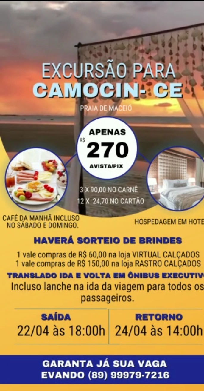 Uma grande excursão para Camocin-CE estar sendo montado nas empresas Gugu Turismo com várias vantagens, além de sorteios e brindes.