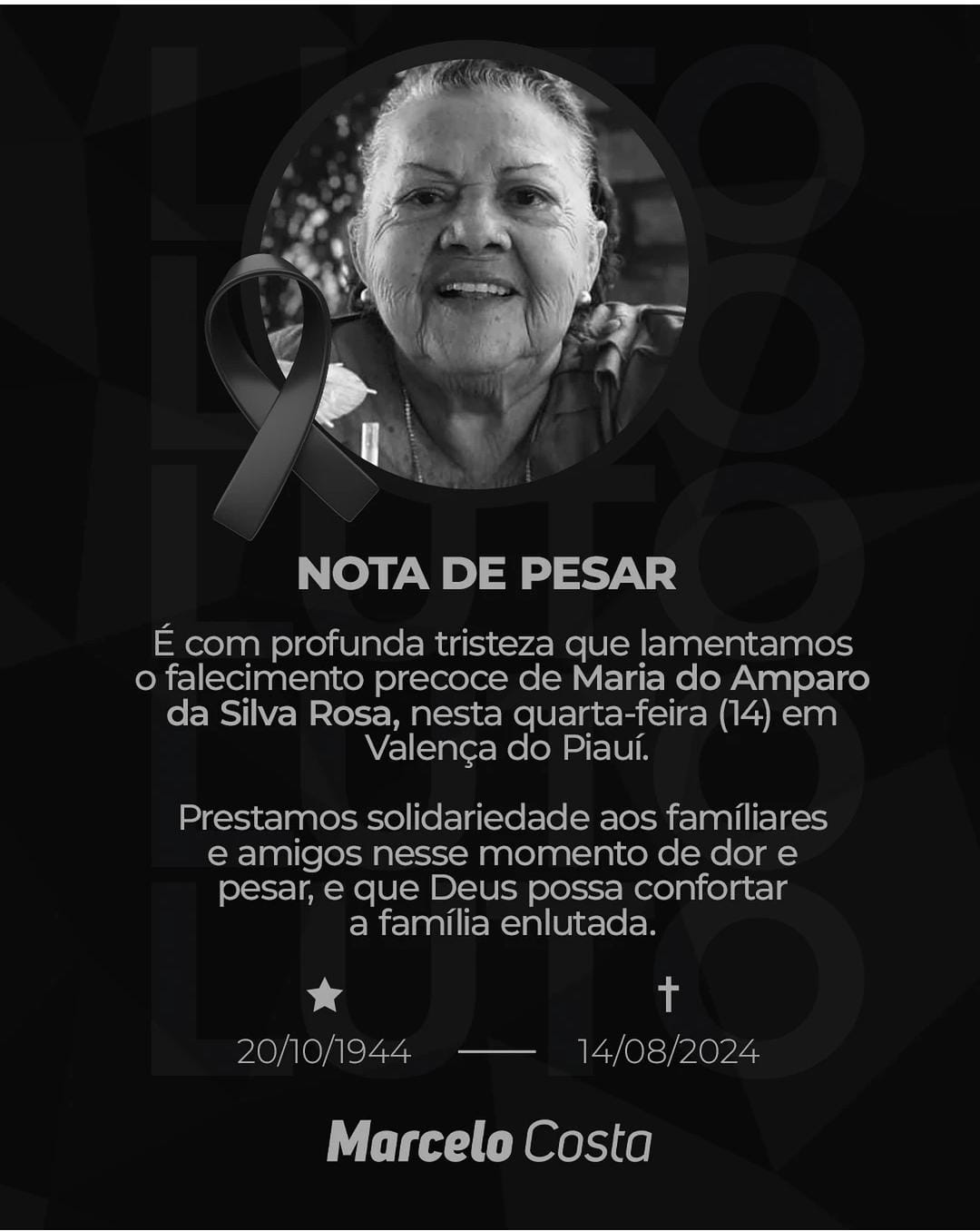 A professora, mãe de família, exemplar esposa e avó de netos, Amparo Rosa veio a falecer na noite desta quarta-feira(14), seu corpo está sendo velado na rua Cícero Portela saída para a cidade de Pimenteiras.