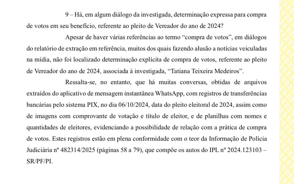 “Apesar de haver várias referências ao termo “compra de votos”, em diálogos do relatório de extração em referência, muitos dos quais fazendo alusão a notícias veiculadas na mídia, não foi localizado determinação explícita de compra de votos, referente ao pleito de Vereador do ano de 2024, associada à investigada, “Tatiana Teixeira Medeiros”. Ressalta-se, no entanto, que há muitas conversas, obtidas de arquivos extraídos do aplicativo de mensagem instantânea WhatsApp, com registros de transferências bancárias pelo sistema PIX, no dia 06/10/2024, data do pleito eleitoral de 2024, assim como de imagens com comprovante de votação e título de eleitor, e de planilhas com nomes e quantidades de eleitores, evidenciando a possibilidade de relação com a prática de compra de votos”, diz em trecho do relatório.