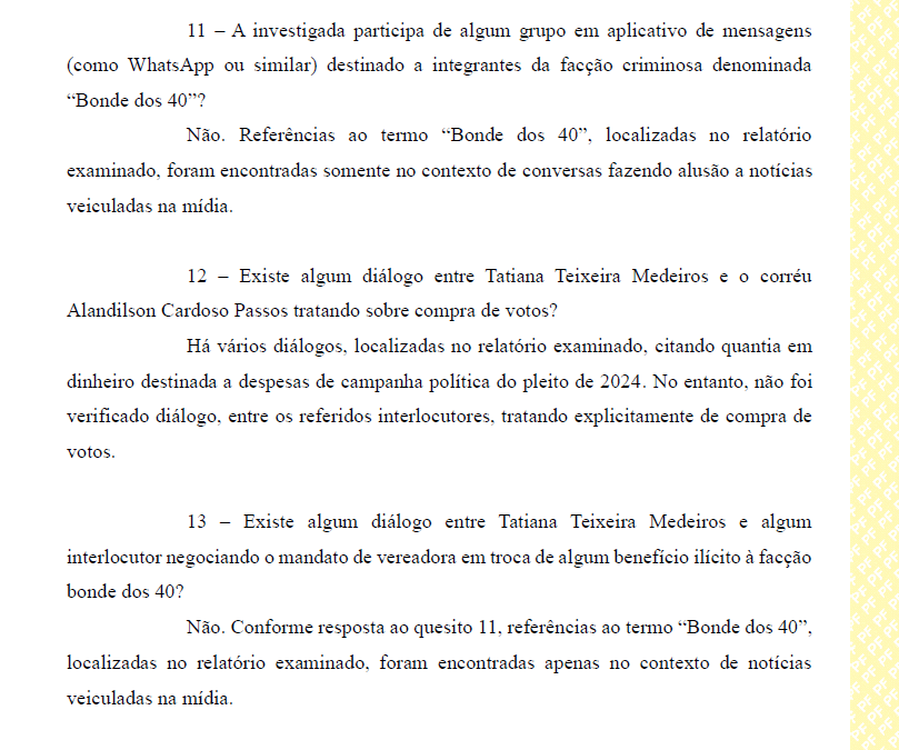 As referências ao termo “Bonde dos 40” encontradas no relatório de extração estavam inseridas em conversas que faziam alusão a notícias veiculadas na mídia, sem indicação de interlocução direta com membros da facção, até mesmo com o então namorado Alandilson Cardos que trata explicitamente de compra de votos ou de negociação do mandato de vereadora em troca de benefício ilícito à facção mencionada.
