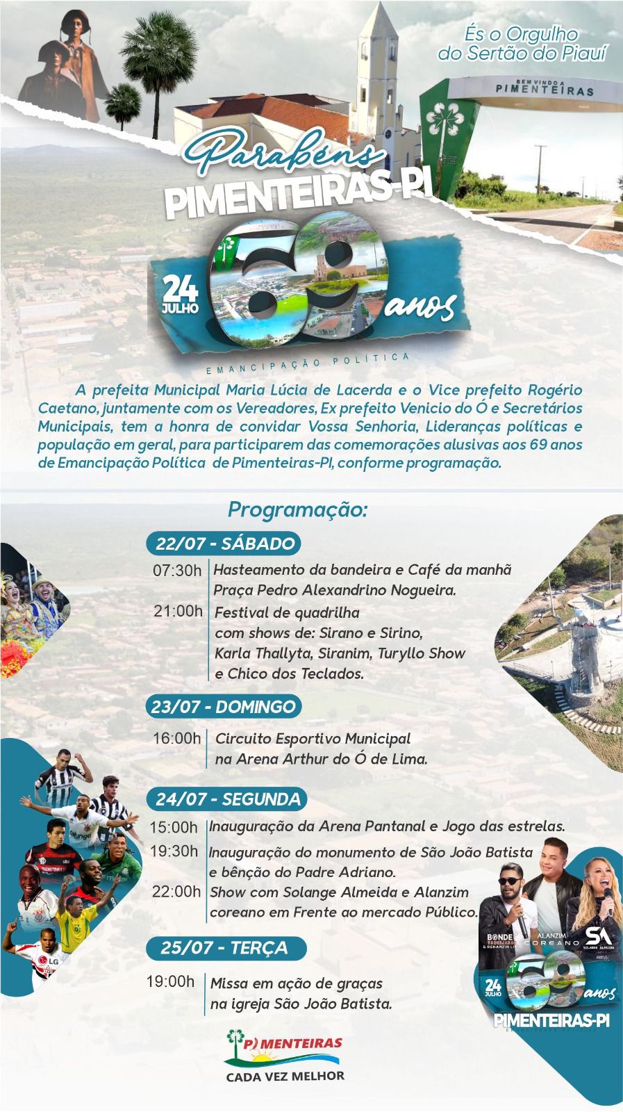 A Prefeitira Municipal de Pimenteiras através da prefeita Lúcia Lacerda, do Vice-prefeito Rogério Caetano e Vereadores, divulgou a programação oficial dos 69 anos de Emancipação Política do Municipio.