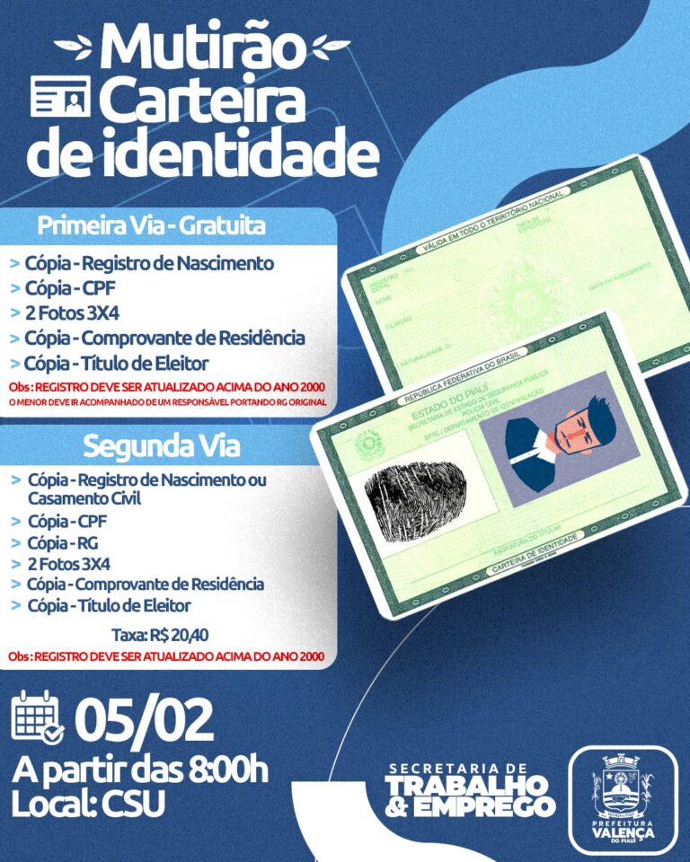 A Prefeitura de Valença do Piaui, através da Secretaria Municipal do Trabalho e Emprego e em parceria com a Secretaria Estado da Segurança Pública, realizará no dia 05 de fevereiro no CSU em Valença, o Mutirão para emissão de primeira e segunda vias de Carteiras de Identidade.