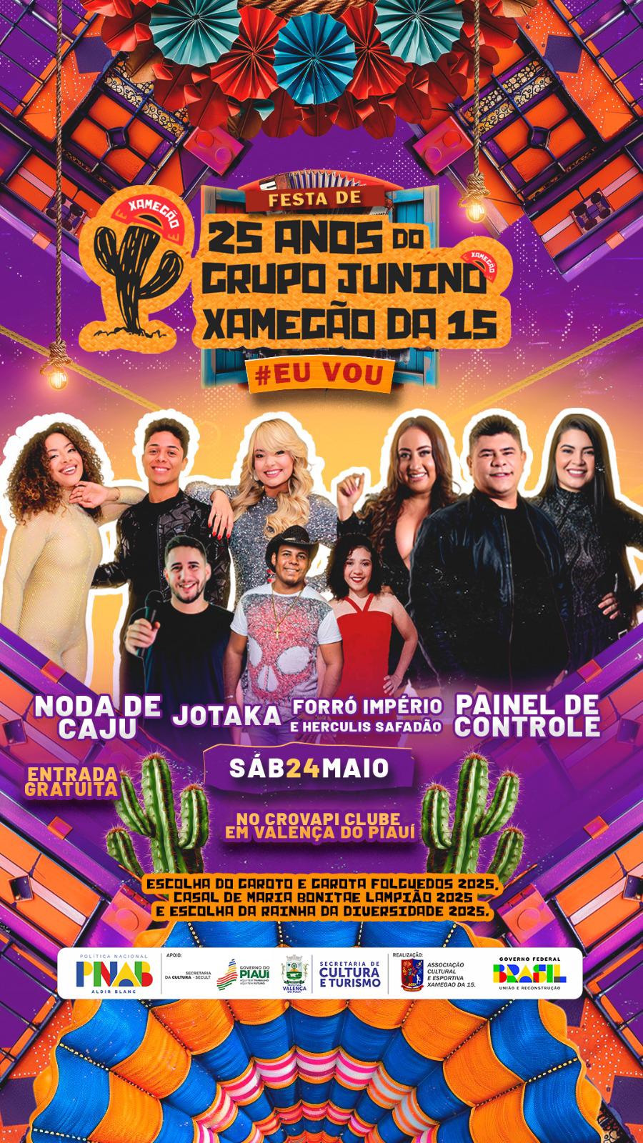 Sábado,24 de Maio de 2025, a Xamegão da 15 comemorará 24 anos, onde o Crovapi Clube será o palco principal para receber as bandas : Noda de Caju e JOTAKA, Hércules e Forró Império e por fim,a Banda Painel de Controle para arrastar todo público valenciano e de toda região valenciana.